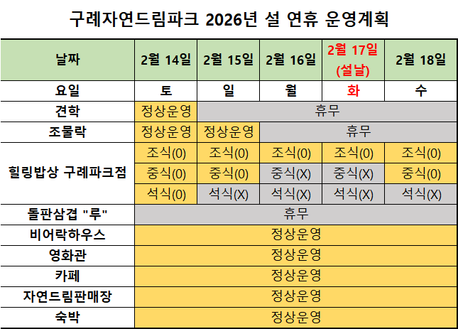 구례자연드림파크 26년 설 명절 연휴 운영 계획