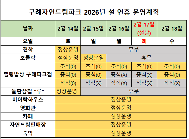 구례자연드림파크 26년 설 명절 연휴 운영 계획